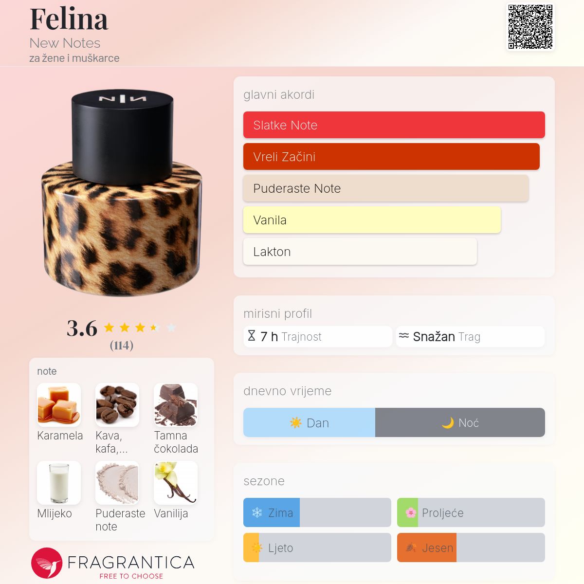 New Notes Felina je intrigantan parfem koji nudi jedinstvenu kombinaciju orijentalnih i vanilijskih nota. Njegova topla, slatka i začinjena aroma čini ga privlačnim za mnoge ljubitelje mirisa. Ako volite mirise koji su istovremeno ugodni i elegantni, Felina bi mogla biti odličan izbor za vas. U 2026. godini, očekuje se da će Felina zadržati svoju popularnost i nastaviti oduševljavati ljubitelje parfema širom svijeta.