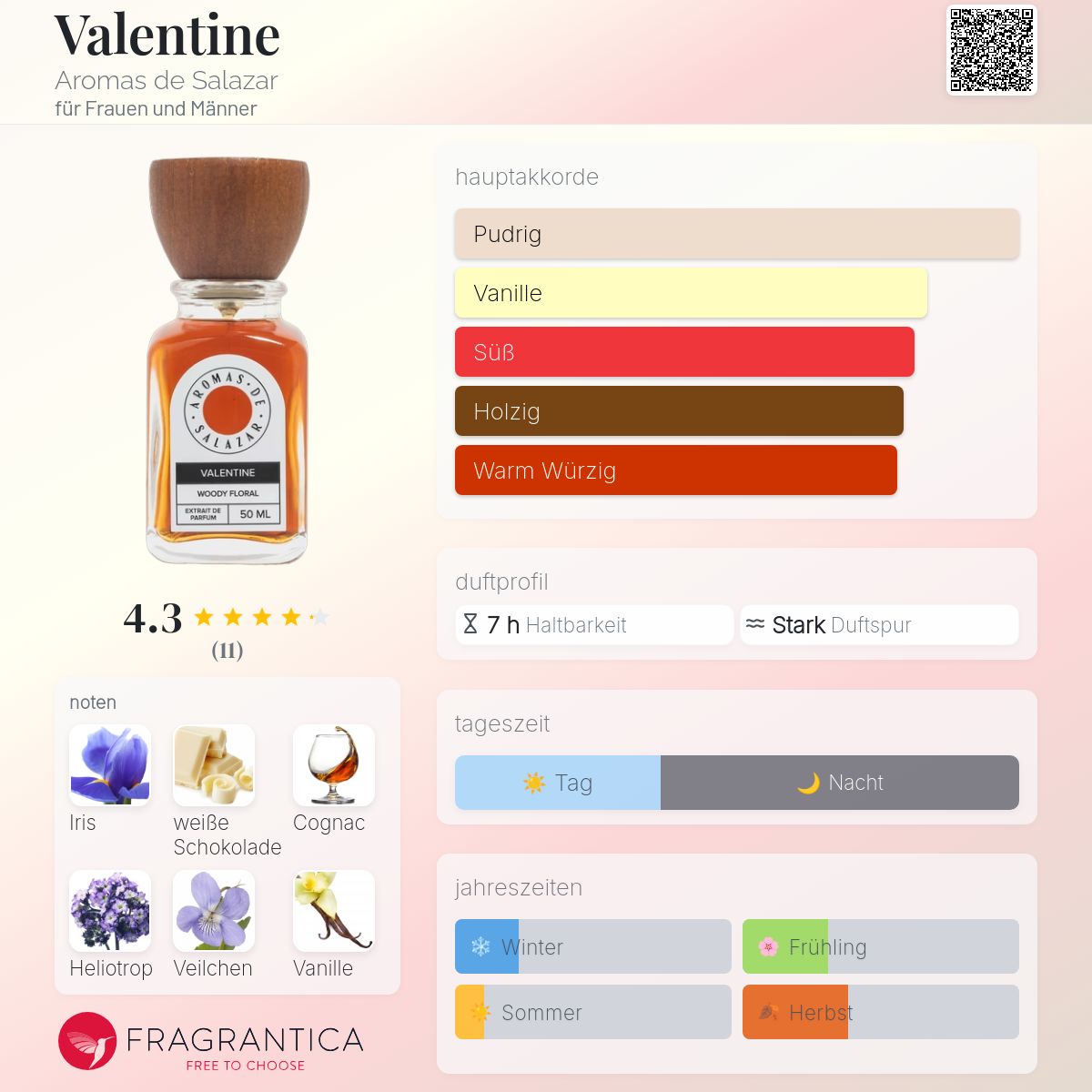 Valentine je zanosna i sofisticirana kreacija od Aromas de Salazar, koja se ističe svojom originalnom kombinacijom cvjetnih, začinskih i gurmanskih nota. Ako tražite parfim koji je jedinstven, kvalitetan i svestran, Valentine je odličan izbor. Iako je cijena nešto viša, kvaliteta i originalnost ovog parfima opravdavaju ulaganje. Preporučujemo isprobavanje Valentine ako ste ljubitelj niche parfimerije i tražite miris koji će vas oduševiti svojom elegancijom i toplinom.